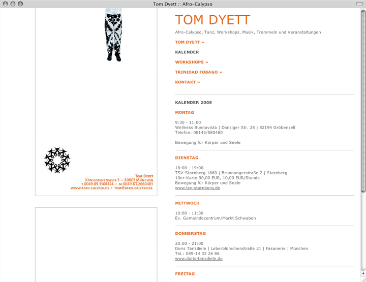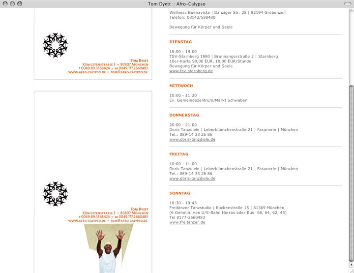 ------------ afro calypso / --------------- internetauftritt afrikanischer tanz ------------------------------------- status: online --- --------------------- konzept, design, programmierung: christine zoche --------- visitenkarten: petra fürst, frauke vieregg, christine zoche ------