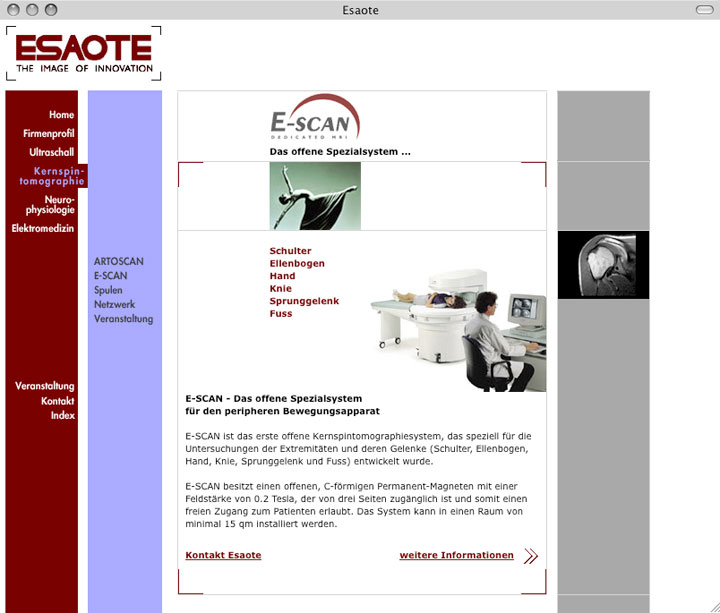 ------------ esaote / --------------- internetauftritt ultraschallgeräte --------- status: offline --- ------ konzept, design und programmierung: petra fürst, christine zoche -------------------------- ----------------------------------------------------