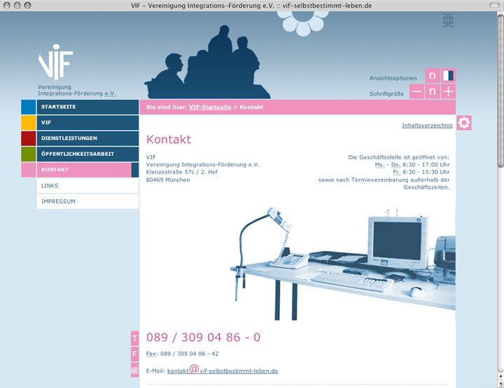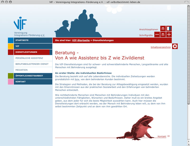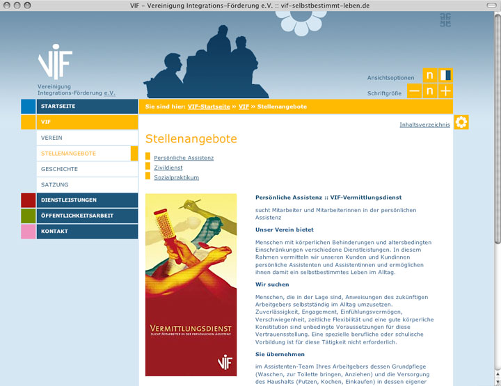------ vif selbstbestimmt leben e. v. / ------------ internetauftritt gemeinnütziger verein ----------------- status: online -------------- ----------------- barrierefreie umsetzung nach WCAG 3 ------------------- programmierung: claus coviello -- webseiten mit sinn - --------------------------- konzept, design: petra fürst, christine zoche ---------- text: frauke vieregg -------------------------